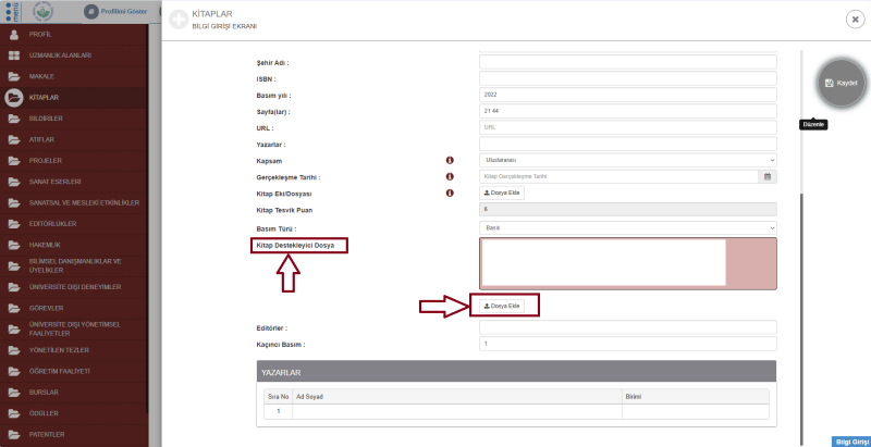 Üniversitemiz akademik personellerimizin "öğretim elemanı" kullanıcı grubu ile ÜBYS sistemine giriş yaptıktan sonra, menü içinde yer alan "Bilgi Girişi" sayfasında soldaki menüden çalışma türlerinin seçimini yaptıktan sonra her bir çalışma için sisteme yükleyecekleri "... Destekleyici Dosya" kısmına ".exe" gibi formatlar hariç diğer tüm formatlarda yükleme yapabilirler.