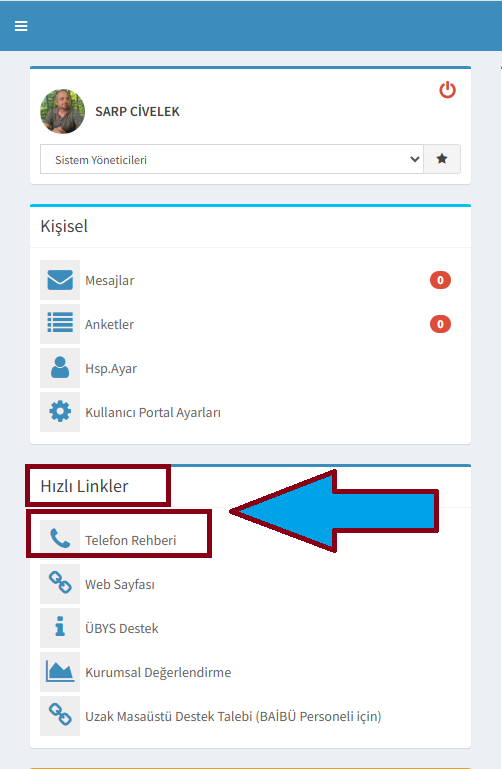 ÜBYS sistemine kullanıcı adı-parola ile girdikten sonra, ana sayfada sol kısımda yer alan "Hızlı Linkler" başlığı altında yer alan "Telefon Rehberi" butonu ile erişim sağlanabilir.