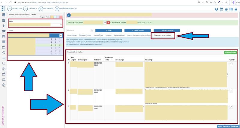 Üniversitemiz öğretim elemanlarının ÜBYS'ye girişte "öğretim elemanı" kullanıcı grubu ile giriş yaptıktan sonra ÜBYS menüde yer alan "Öğretim Elemanı&Danışmanlık" sayfasında soldaki kayar menüde yer alan "ders tanım ve içerikleri" ile açılan sayfada birim ve ders seçimi ile veri girişi sağladıkları derslere ait "öğrenme çıktıları notları" alanındaki veri çoklaması sorunu giderilmiştir.