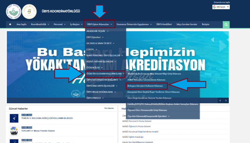 Üniversitemiz akademik personellreinin ÜBYS içinde "Öğretim Elemanı&Danışmanlık" sayfasında yürüttükleri Bologna Süreçleri ile ilgili olarak hazırladığımız kılavuz web sayfamız üst kısımdaki işlem menüsünde yer alan "ÜBYS İşlem Kılavuzları>>ÖĞRETİM ELEMANI KULLANICILARI" başlığına eklenmiştir.